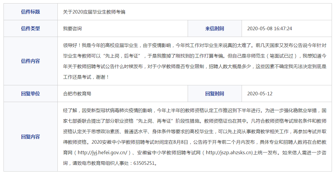 回復(fù)內(nèi)容:經(jīng)了解,因受新型冠狀病毒肺炎疫情的影響,今年上半年的教師資格認(rèn)定工作推遲到下半年進(jìn)行。為進(jìn)一步強(qiáng)化穩(wěn)就業(yè)舉措,國家七部委聯(lián)合提出了部分職業(yè)資格“先上崗、再考證”階段性措施。教師資格證也在其中。凡符合教師資格考試報名條件和教師資格認(rèn)定關(guān)于思想政治素質(zhì)、普通話水平、身體條件等要求的高校畢業(yè)生,可以先上崗從事教育教學(xué)相關(guān)工作,再參加考試并取得教師資格。2020安徽中小學(xué)教師招聘考試時間定在8月8日,公告將于開考前二個月內(nèi)發(fā)布,具體專業(yè)和招聘人數(shù)將在合肥教育網(wǎng)(http://jyj.hefei.gov.cn/)、安徽省中小學(xué)教師招聘考試網(wǎng)(http://jszp.ahzsks.cn)上統(tǒng)一發(fā)布。如來信人需進(jìn)一步咨詢,請致電市教育局組織人事處:63505251。
