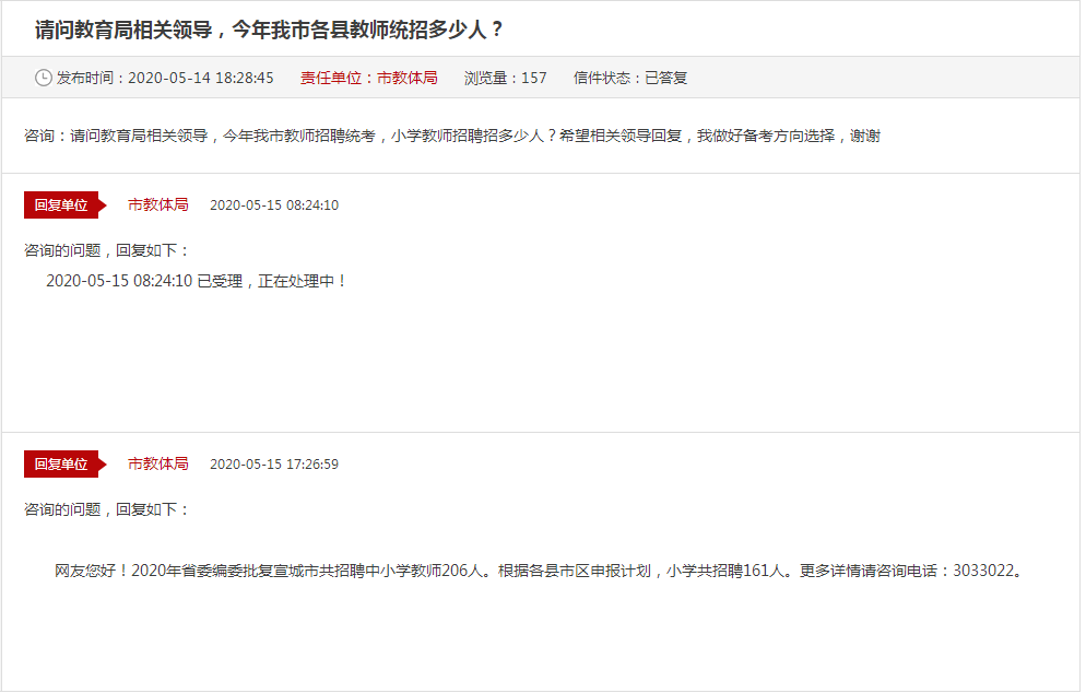 在5月14日,有網(wǎng)友在宣城市教育體育局互動交流平臺提問:請問教育局相關(guān)領(lǐng)導(dǎo),今年我市教師招聘統(tǒng)考,小學(xué)教師招聘招多少人?宣城市教體局也是給出了如下回復(fù):2020年省委編委批復(fù)宣城市共招聘中小學(xué)教師206人。根據(jù)各縣市區(qū)申報計劃,小學(xué)共招聘161人。