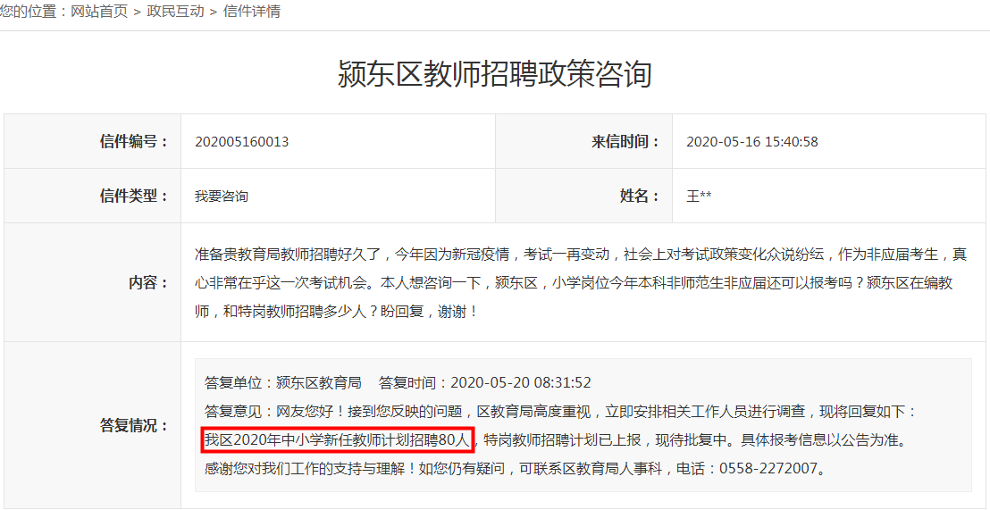 內(nèi)容:準(zhǔn)備貴教育局教師招聘好久了,今年因為新冠疫情,考試一再變動,社會上對考試政策變化眾說紛紜,作為非應(yīng)屆考生,真心非常在乎這一次考試機(jī)會。本人想咨詢一下,潁東區(qū),小學(xué)崗位今年本科非師范生非應(yīng)屆還可以報考嗎?潁東區(qū)在編教師,和特崗教師招聘多少人?盼回復(fù),謝謝!答復(fù)情況: