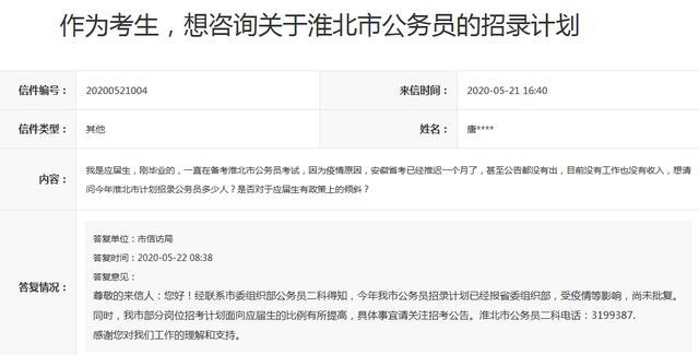信件內(nèi)容:我是應(yīng)屆生,剛畢業(yè)的,一直在備考淮北市公務(wù)員考試,因?yàn)橐咔樵?,安徽省考已?jīng)推遲一個(gè)月了,甚至公告都沒有出,目前沒有工作也沒有收入,想請(qǐng)問今年淮北市計(jì)劃招錄公務(wù)員多少人?是否對(duì)于應(yīng)屆生有政策上的傾斜?