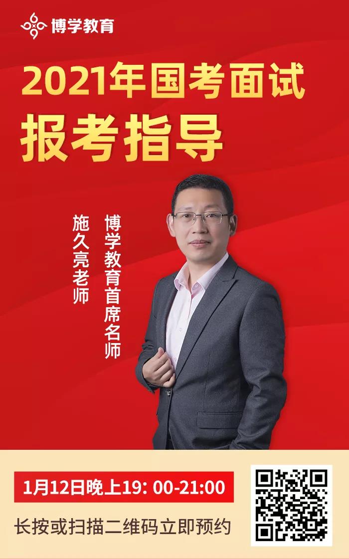不打無準(zhǔn)備之仗,為幫助考生們備考2021年國考面試,博學(xué)教育將于1月12日晚上19:00舉辦直播講座。首席名師施久亮老師帶您提前了解歷年國考面試的基本情況,以及不同部門的試題特點(diǎn)和評分要點(diǎn)等等,并提供專業(yè)的備考建議,干貨滿滿!