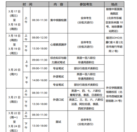 近年來,外交部的面試形式均為結(jié)構(gòu)化面試,面試時間為20-30分鐘,題量4-11題,考官讀題。除了面試之外,還需進(jìn)行相應(yīng)的專業(yè)能力測試和心理素質(zhì)測試,其中專業(yè)能力測試包括綜合知識與能力測試(筆試)、專業(yè)筆試、外語筆試、外語口試;心理素質(zhì)測試分批次進(jìn)行,不計入綜合成績。
