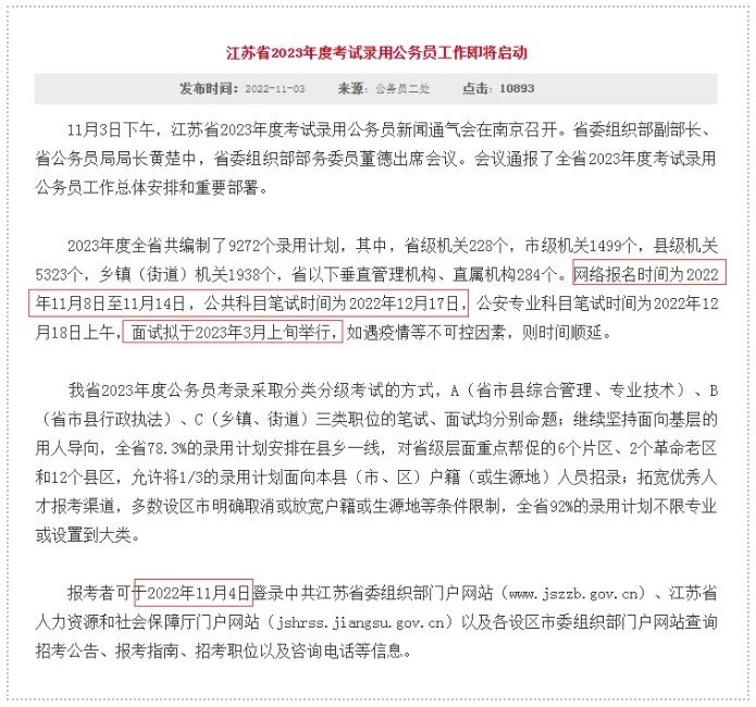 2023江蘇公務員考試消息已出,快來查收重要信息:招錄人數:9272人,其中,省級機關228個,市級機關1499個,縣級機關5323個,鄉(xiāng)鎮(zhèn)(街道)機關1938個,省以下垂直管理機構、直屬機構284個。