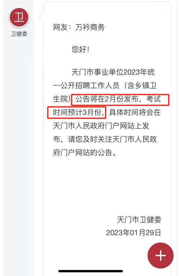天門衛(wèi)健委回復:天門市事業(yè)單位2023年統(tǒng)一公開招聘工作人員(含鄉(xiāng)鎮(zhèn)衛(wèi)生院)公告將在2月份發(fā)布,考試時間預計3月份……