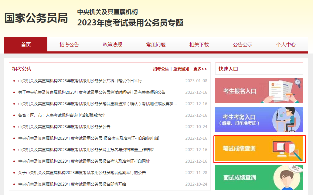 國(guó)考成績(jī)發(fā)布后,考生通過(guò)中央機(jī)關(guān)及其直屬機(jī)構(gòu)2023年度考試錄用公務(wù)員專(zhuān)題網(wǎng)站,進(jìn)入“筆試成績(jī)查詢(xún)”網(wǎng)頁(yè)即可查成績(jī),進(jìn)面名單可能會(huì)在查成績(jī)的同一天發(fā)布,也有可能會(huì)延遲一兩天發(fā)布。